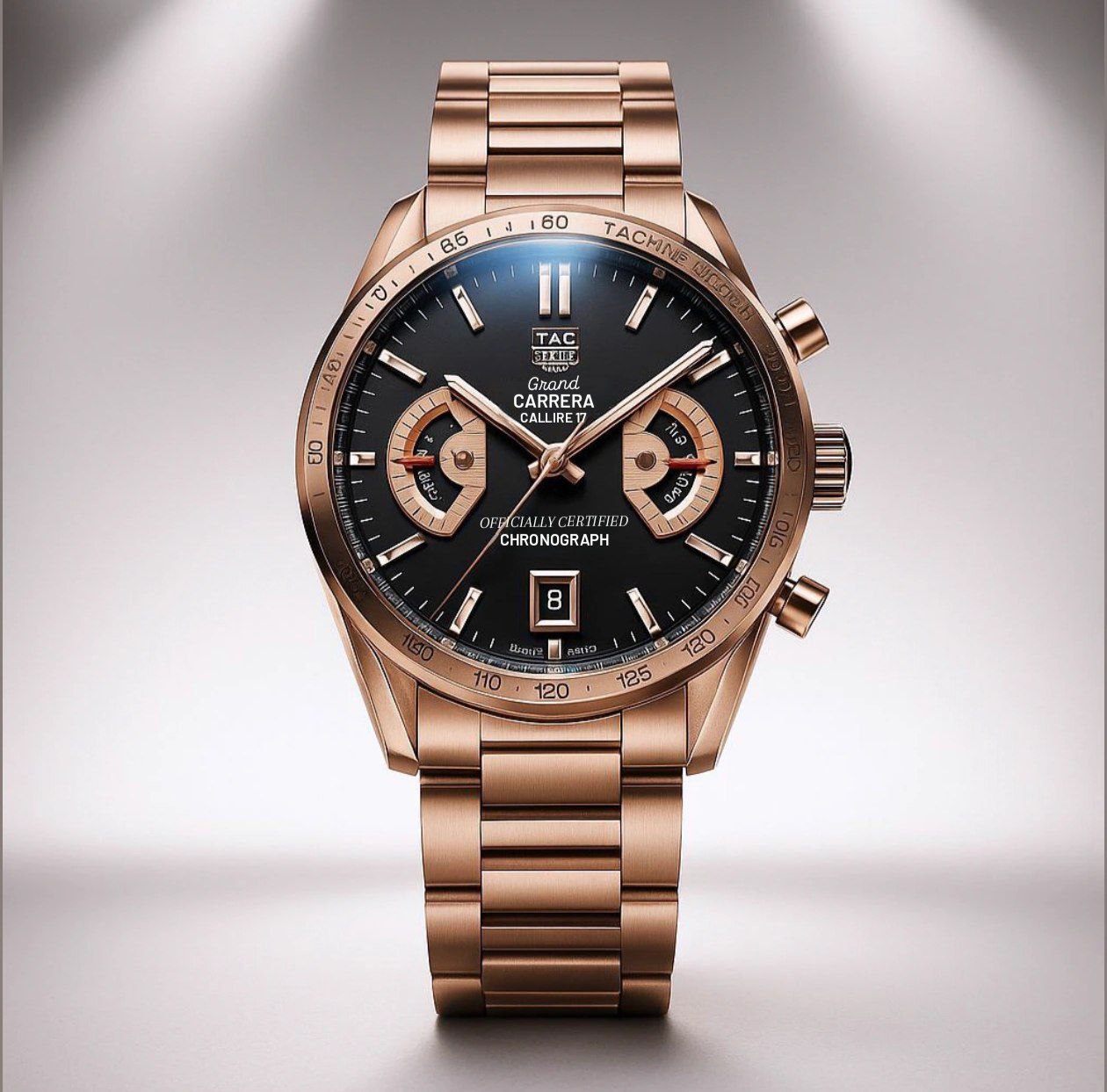 The TGH-R Carrera Calibre 17 RS2 is a premium men’s luxury chronograph watch designed for elegance, precision, and durability. Featuring a polished stainless steel case, Swiss-inspired automatic Calibre 17 RS movement, scratch-resistant sapphire crystal, and a black textured dial with rotating system disc indicators, this timepiece blends sophisticated style with reliable performance.