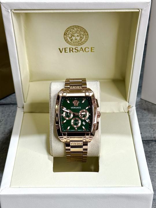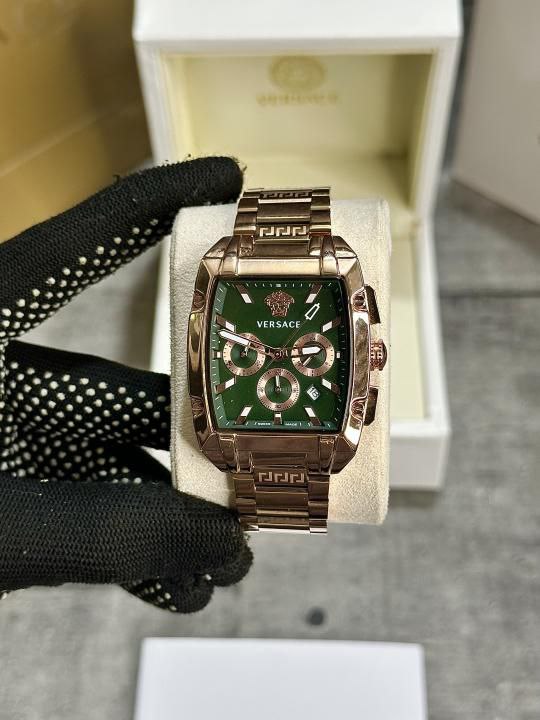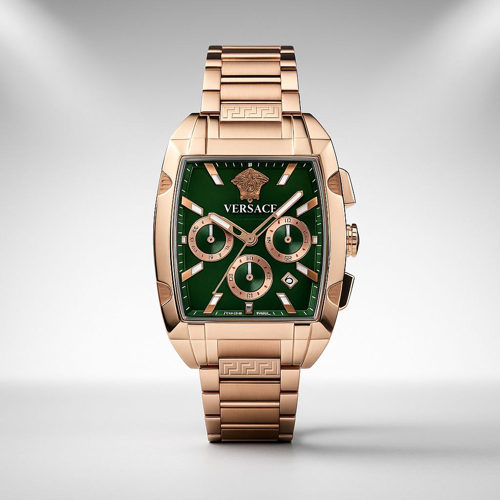 The VRSC Dominus Chronograph VE6H00523 in Green Dial is a premium men’s luxury watch offering precision, style, and durability. It features Japanese quartz movement, a 42MM stainless steel rose gold tonneau case, and a green chronograph dial with date indicator. The Greca-pattern stainless steel strap with butterfly clasp ensures comfort and enhances its luxurious look.