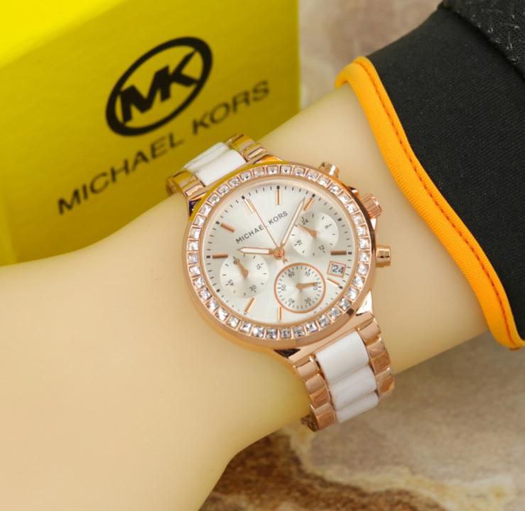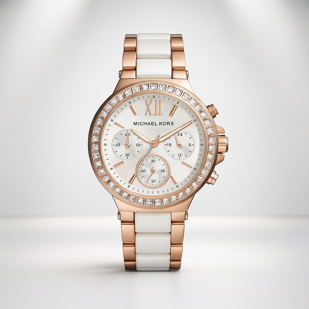 The MK Parker Chronograph Gold is a stylish and functional chronograph watch designed for women who love precision and elegance. Featuring a striking white sunray dial with crystal hour markers, a two-tone stainless steel ceramic-steel case, and a matching two-tone stainless steel bracelet, this watch is powered by chronograph quartz movement and is water resistant for everyday use.